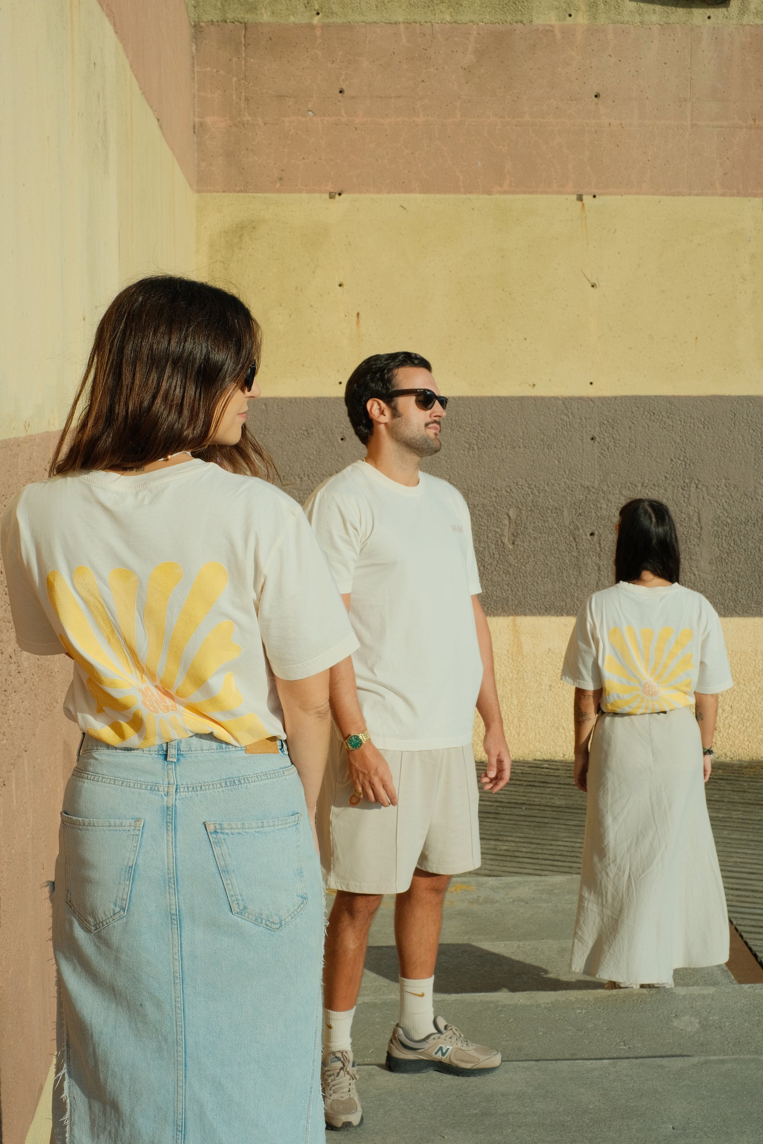 160 gramas de algodão orgânico e reciclado, de cor branco deserto. Tipografia “TAN BOM” em impressão digital 3D ao nível do coração, para bater intensamente, porque com amor tudo flui melhor. Nas costas, desenho do sol com o emblema “TAN BOM”, em impressão digital 3D, para inspirar a correr sempre atrás do sol e dos sonhos.