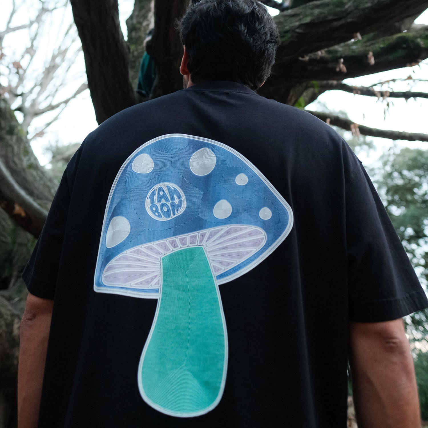 190 gramas de algodão orgânico e reciclado, de cor preta. Tipografia “TAN BOM” em impressão digital 3D ao nível do coração, em gradiente de cores pastel, como a cor única de um cogumelo radiante. Nas costas, desenho do cogumelo com o emblema “TAN BOM”, em impressão digital 3D, para nunca te esqueceres que és especial e inspirador como o cogumelo.