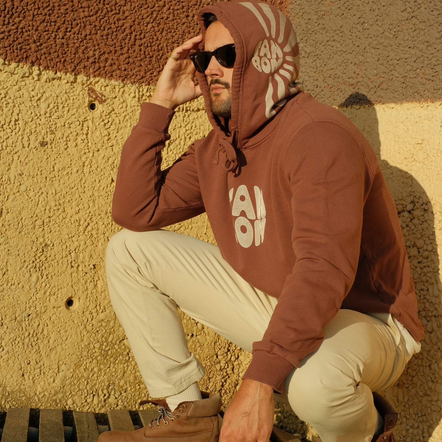 320 gramas algodão orgânico e reciclado, de cor castanho terra, para estares de hoodie, sempre bem e confortável.